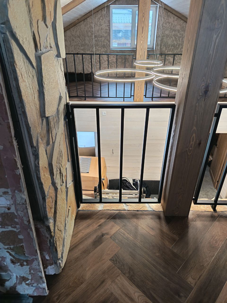 Ограждение монтируется к деревянным ступеням или боковому косоуру с помощью скрытого или декоративного крепежа — выбор зависит от концепции интерьера. Металл сочетается с паркетной доской, ламинатом и массивом дерева, создавая гармоничный контраст в стиле лофт или скандинавского минимализма.