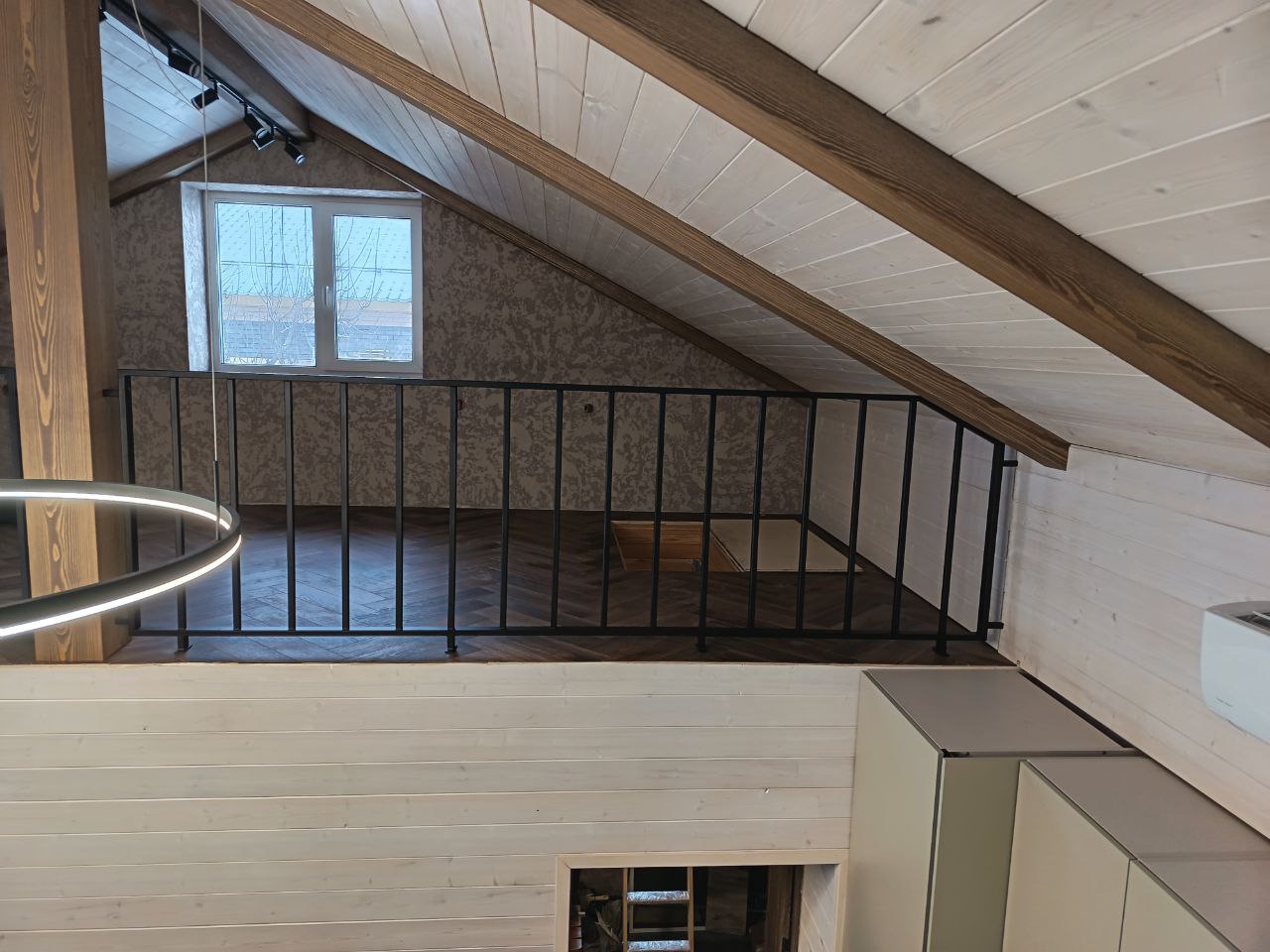 Ограждение “Астра” — современное ограждение в индустриальном стиле для загородных домов, таунхаусов и мансард в Самаре и Самарской области. Строгие черные вертикальные стойки в сочетании с натуральным деревом создают эффектный контраст и визуально расширяют пространство на обоих этажах. Конструкция гарантирует безопасность, подчеркивает современный дизайн интерьера и адаптируется под нестандартные проемы.